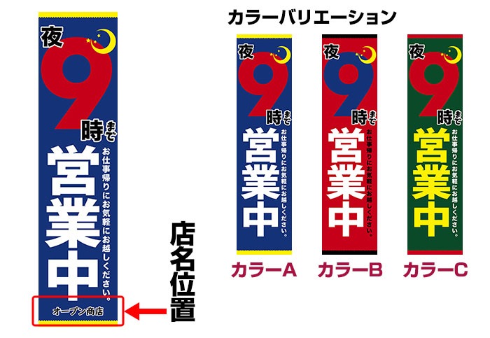 のぼり旗「夜◯時まで営業中」 強化縫製/セミデザイン/600mm×1800mm