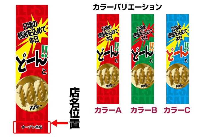 スリムのぼり旗「どーんと◯円均一」 強化縫製/セミデザイン/450mm×1800mm