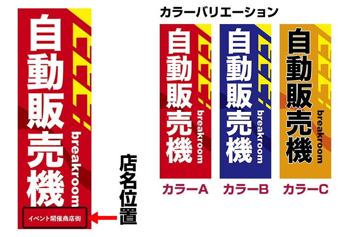 「自動販売機」をモチーフにしたのぼりデザイン。読みやすいハッキリした文字を使用した、シンプルでスタイリッシュなデザインです。