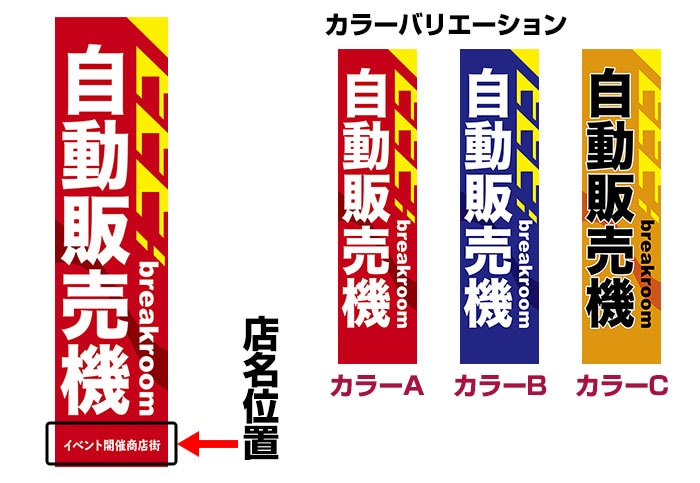 「自動販売機」をモチーフにしたのぼりデザイン。読みやすいハッキリした文字を使用した、シンプルでスタイリッシュなデザインです。