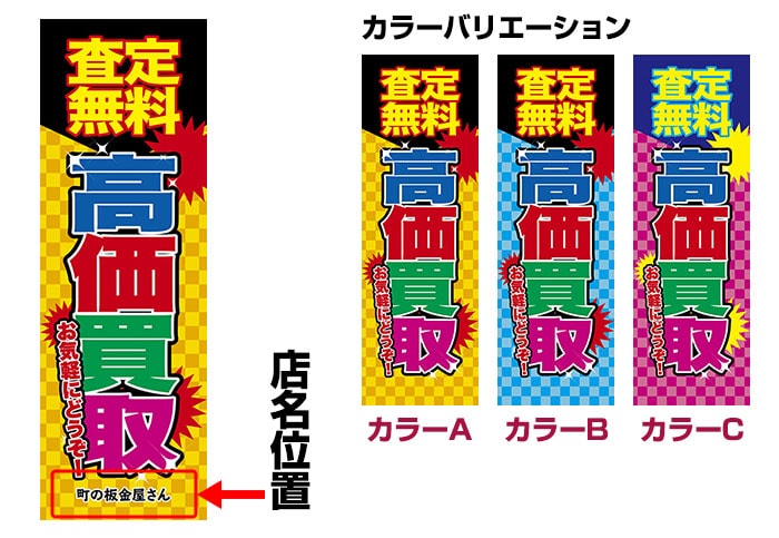 「査定無料 高価買取」をモチーフにしたのぼりデザイン。派手な色使いでとても目立つデザインです。