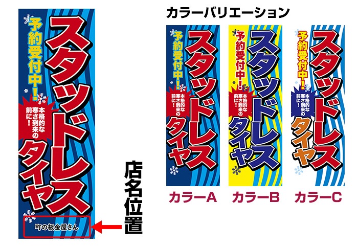 「スタットレスタイヤ 予約受付中!」をモチーフにしたのぼりデザイン。忘れがちなタイヤの冬支度をアピールします。