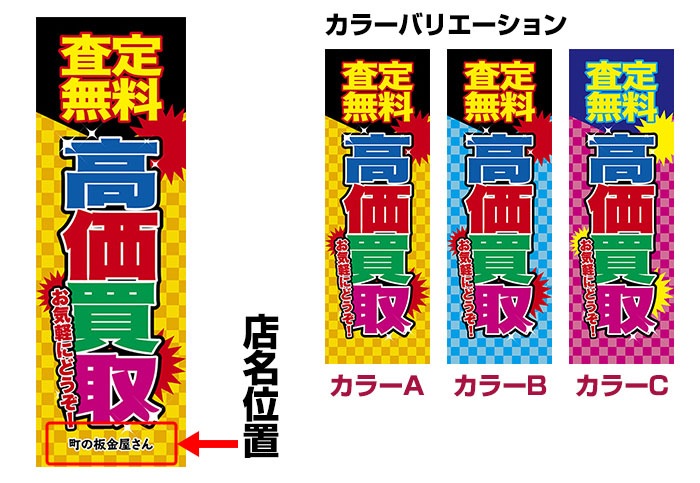 「査定無料 高価買取」をモチーフにしたのぼりデザイン。派手な色使いでとても目立つデザインです。