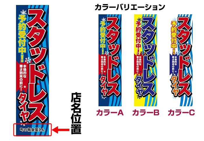 「スタットレスタイヤ 予約受付中!」をモチーフにしたのぼりデザイン。忘れがちなタイヤの冬支度をアピールします。