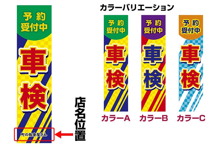 スリムのぼり旗「予約受付中車検」 縁縫い/セミデザイン/450mm×1800mm
