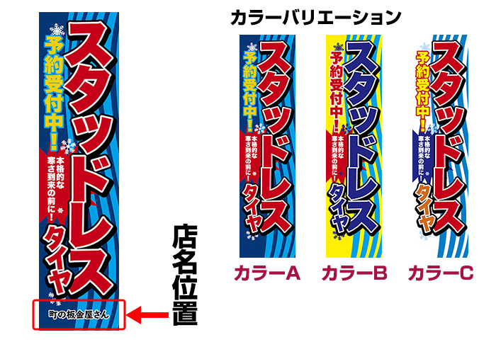 「スタットレスタイヤ 予約受付中!」をモチーフにしたのぼりデザイン。忘れがちなタイヤの冬支度をアピールします。