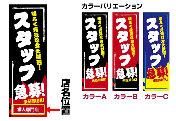 のぼり旗「スタッフ急募!」 強化縫製/セミデザイン/600mm×1800mm