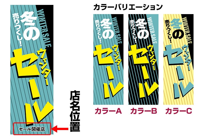 「冬の売りつくし!ウィンターセール」をモチーフにしたのぼりデザイン。勢いのあるポップなデザインでセールを盛り上げます。