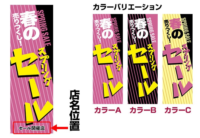「春の売りつくし!スプリングセール」をモチーフにしたのぼりデザイン。勢いのあるポップなデザインでセールを盛り上げます。