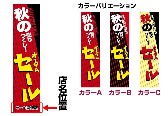 「秋の売りつくし!オータムセール」をモチーフにしたのぼりデザイン。勢いのあるポップなデザインでセールを盛り上げます。